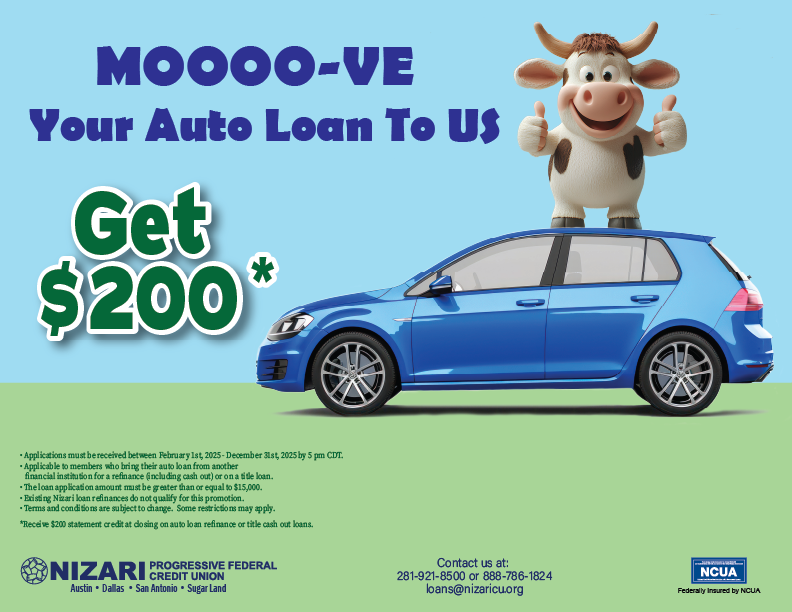 • To qualify for this promotion, bring your auto loan from another financial institution to Nizari or cash out the equity in your vehicle upon refinancing or on a paid-off vehicle. The loan application amount must be greater than or equal to $15,000.