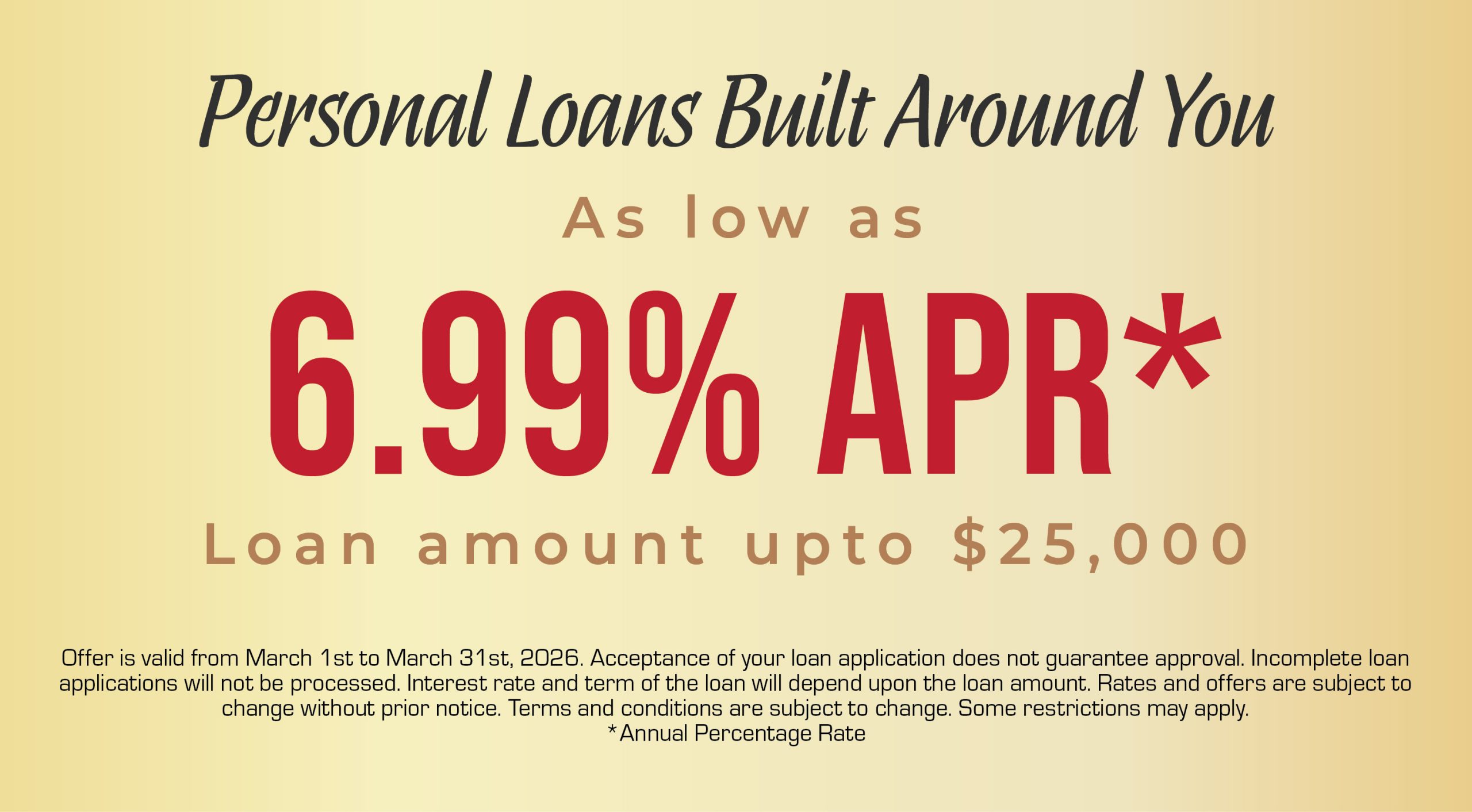 - Interest rate and term of the loan will depend upon the loan amount. Rates and offers are subject to change without prior notice.