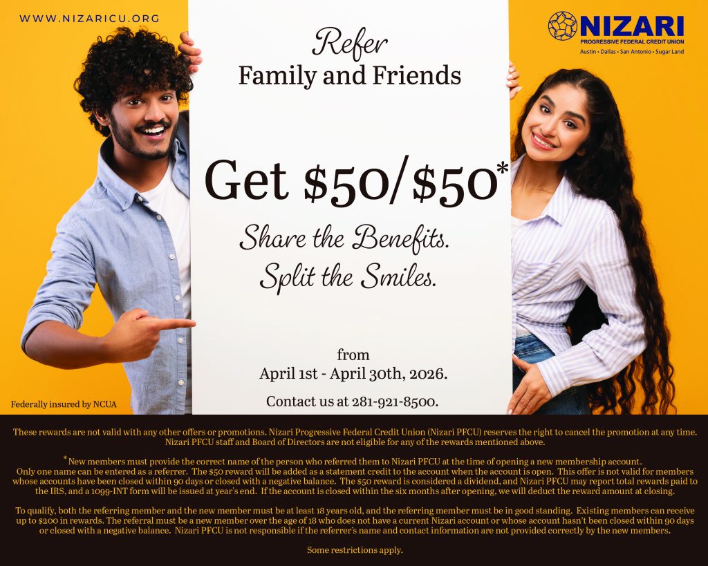 Only one name can be entered as a referrer. The $50 reward will be added as a statement credit to the account when the account is open. This offer is not valid for members whose accounts have been closed within 90 days or closed with a negative balance. The $50 reward is considered a dividend, and Nizari PFCU may report total rewards paid to the IRS, and a 1099-INT form will be issued at year’s end. If the account is closed within the six months after opening, we will deduct the reward amount at closing.